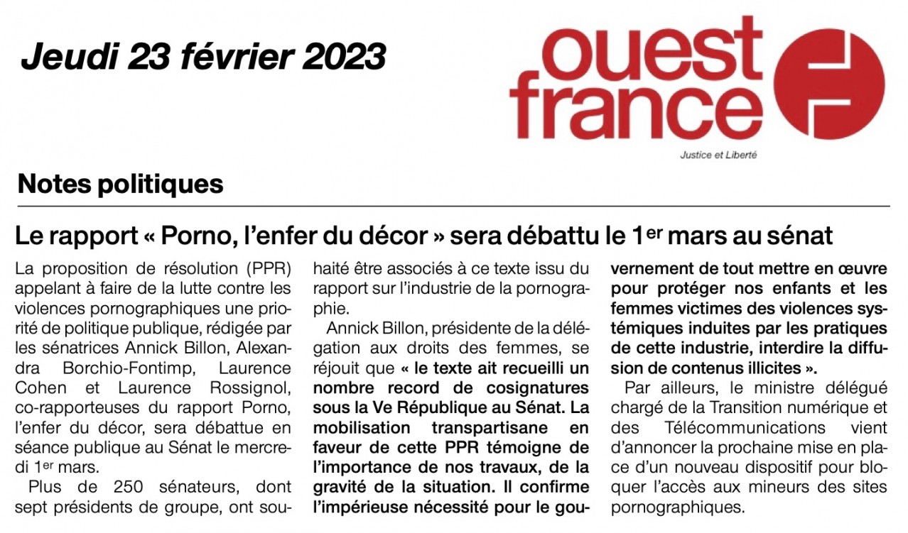 La proposition de résolution (PPR) appelant à faire de la lutte contre les violences pornographiques une priorité de politique publique, rédigée par les sénatrices Annick Billon, Alexandra Borchio-Fontimp, Laurence Cohen et Laurence Rossignol, co-rapporteures du rapport Porno, l’enfer du décor, sera débattue en séance publique au Sénat le mercredi 1er mars.